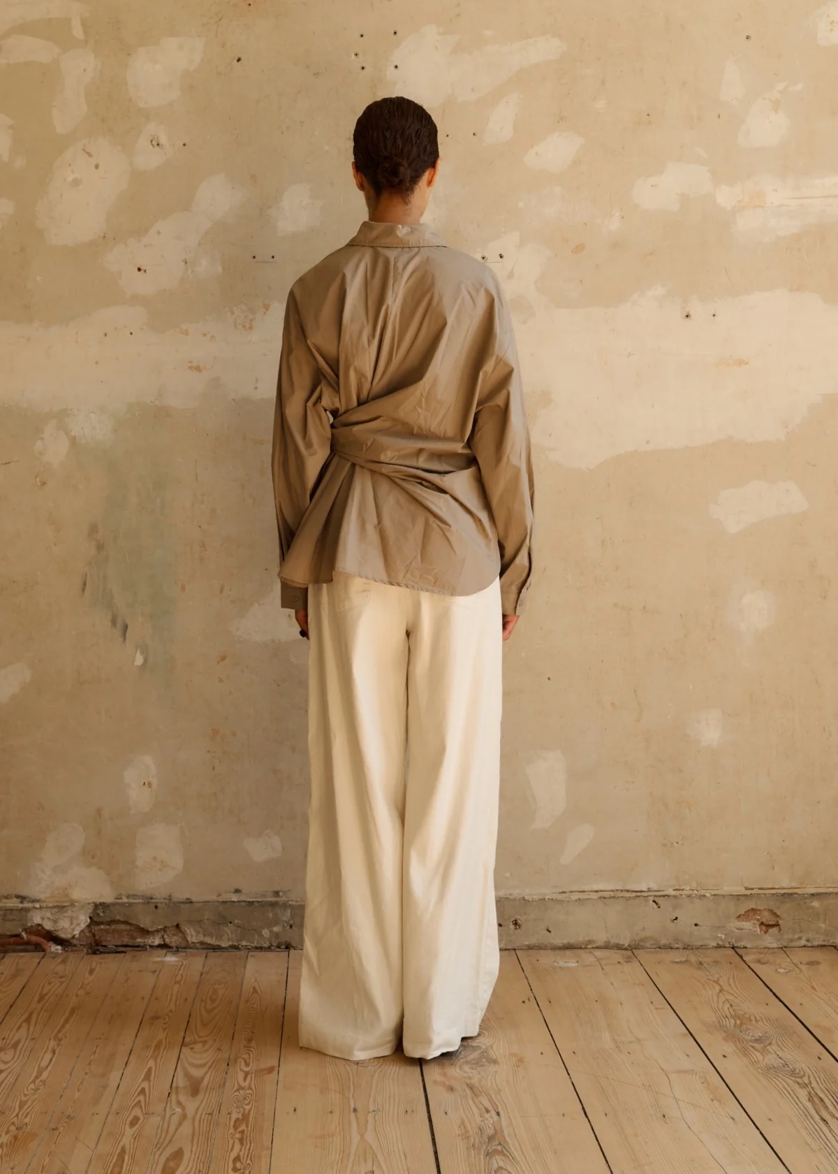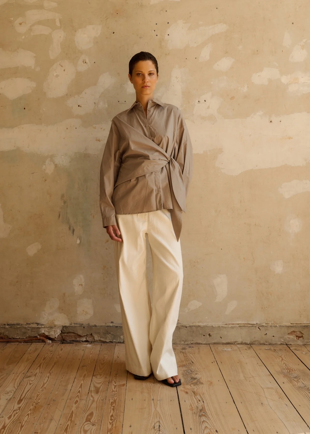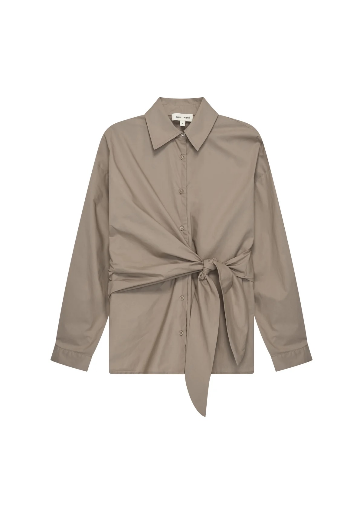 The fitted sleeves keep the look clean, while the knotted closure detail adds a subtle twist — giving this elegant piece a touch of modern sophistication. Perfect for creating a polished yet distinctive look.